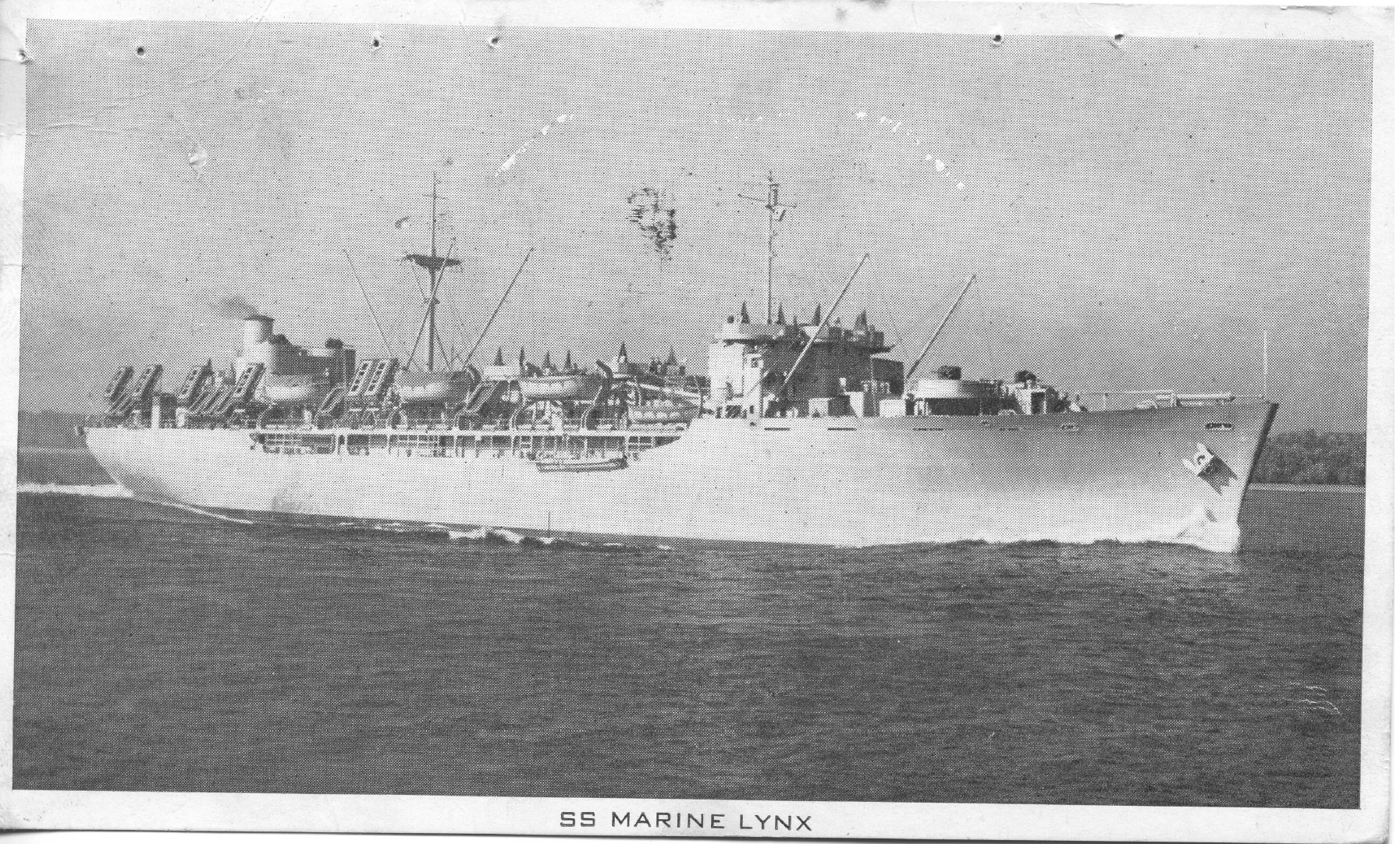 Postcard of the SS Marine Lynx from Isabelle Stinson to Ethelwyn Reid written on board the Lynx. The picture on the front shows the Lynx traveling in a narrow channel. The back is a hand-written letter. There are two US 1 cent stamps, and a red stamp saying "Save the Easy Way Buy US Bonds on Payroll Savings." Another stamp says "San Francisco, Jan. 22, 1947."