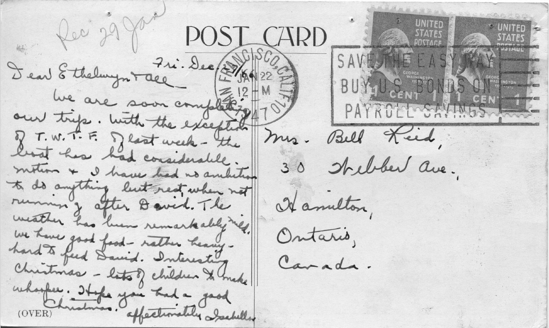Addressed to Mrs. Bill Reid, 30 Webber Ave. Hamilton, Ontario, Canada. Dear Ethelwyn & All: We are soon completing our trip. With the exception of T.W.T.F. of last week - the boat has had considerable motion & I have had no ambition to do anything but rest, when not running after David. The weather has been remarkably mild. We have good food - rather heavy - hard to feed David. Interesting Christmas - lots of children to make whoopee. Hope you had a good Christmas. Affectionately, Isabelle.