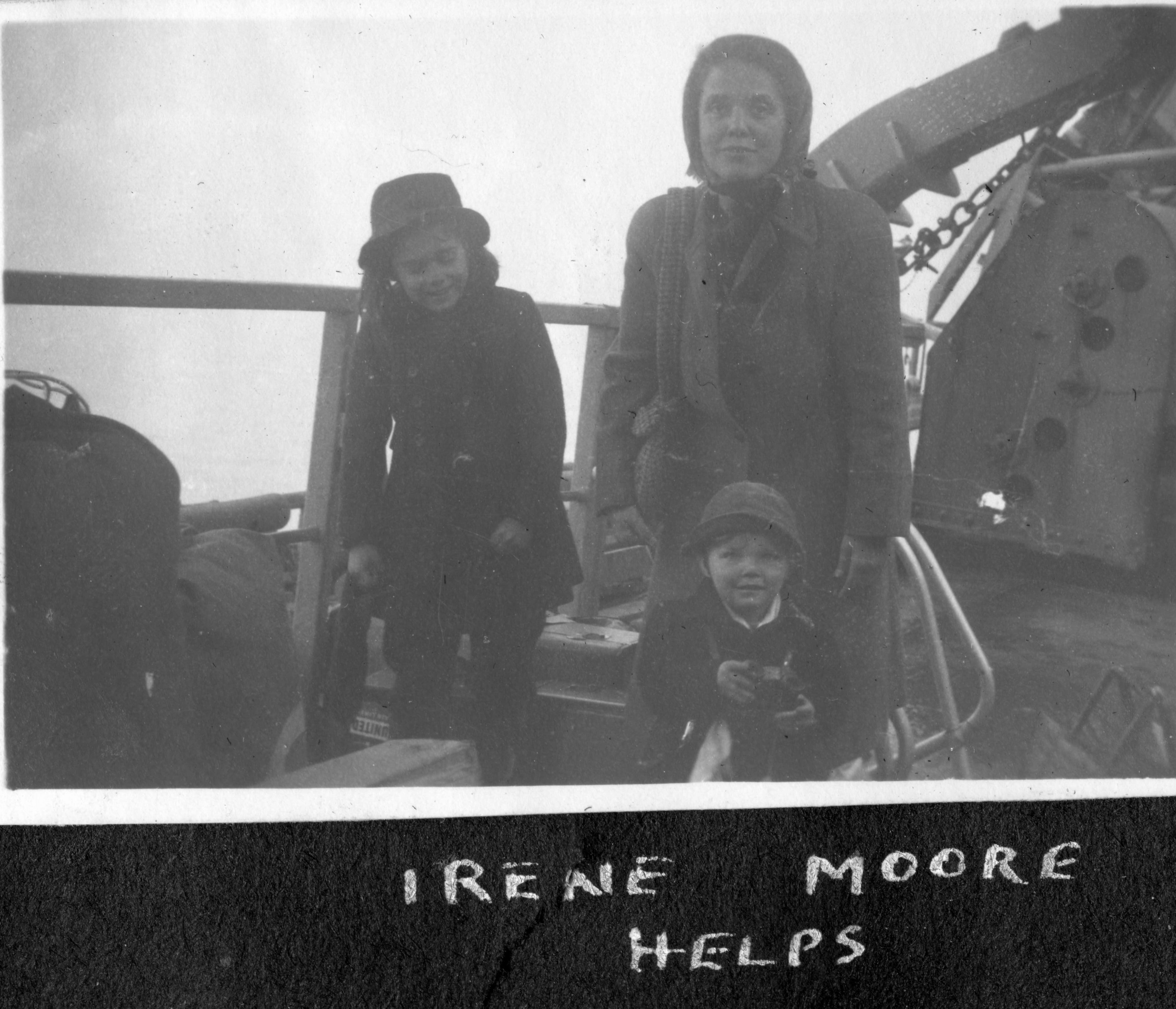 Irene Moore helps Isabelle Stinson with her luggage while boarding the Marine Lynx at the San Francisco Pier 35 on their way to China after WWII. The Stinson children Dora and David are sitting in among the suitcases.