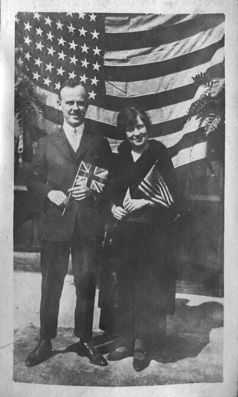 Morley and Gladys Sellery stand in front of a large American flag. Morley holds a small British flag, while Gladys holds a small American flag.