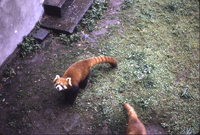 Red Pandas at Xiqu Park, 1975 A red panda and the back half of another red panda in a zoo enclosure.