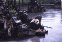 A Panda Sitting on Ice at Xiqu Park, 1975 An adult panda holds a stalk of bamboo while sitting on what appears to be ice in a zoo enclosure.