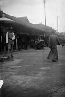 Street Scene with Soldier and Scholar A street scene in an unidentified town shows, at left, a well-dressed soldier standing under what appears to be a streetlight. Walking away from the camera, a man dressed in a scholar's gown and fedora hat glances at the soldier. Electrical wires rise high above the two-story buildings that line the street. Two man-powered vehicles are also visible in the scene.