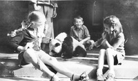 Two Girls and a Boy with a Panda Bill Willmott and two unidentified girls sit on a porch with Pandah. A servant is on the porch with them. The older girl holds Pandah's leash.