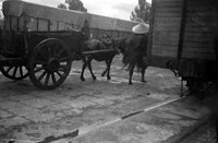 Street Scene with Horse Cart and Train Car A man wearing a bamboo rain hat and poncho leads a horse and cart over a paved road next to a train track and car.