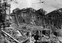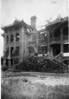 Back of Tzeliutsing Hospital Bombed The back of the Tzeliutsing Hospital, or possibly the adjoining women's hospital, showing one side of the roof and the walls torn down completely after the Japanese bombing.