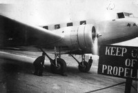 Isabelle Stinson in Window of Plane Airline workers are preparing the Douglas DC2 for take off from the Hong Kong airport. Isabelle Stinson can be seen in the window above the wing. A sign in the foreground seems to warn people to stay out of reach of the propellers.