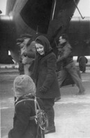 David and Isabelle Stinson at the Hankow Airport Isabelle and David Stinson (2 years old) seen from behind as they wait for their Curtiss C-46 Commando to be refueled at Hankow, enroute from Shanghai to Chongqing. Both wear winter clothes in the freezing temperatures, Isabelle in a sporty jodhpur ensemble, David is a woolen snow suit. Trucks can be seen next to the plane in the background.