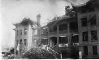 Left Side of Tzeliutsing Hospital Bombed A close look at the damage to the Tzeliutsing Hospital's left wing and central stories after being hit by Japanese bombs. The roof is complete gone over two of the five archways.