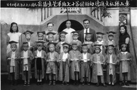Formal Portrait of Leshan Kindergarten Graduating Class The graduating class of kindergarten students stand in two rows wearing mortarboard hats and holding diplomas. John Stinson, Eunice Peters, and three unidentified Chinese teachers stand in the back row. A Chinese inscription is on a banner across the top.