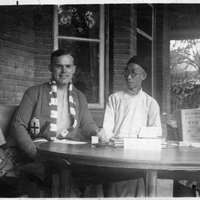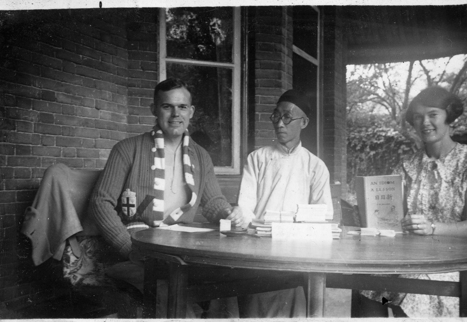 John and Isabelle Stinson pose at table on porch with their teacher while learning Chinese language. John is wearing his university sweater and scarf. Dora is holding the language textbook by F.W. Baller, "An Idiom a Lesson." Their teacher is appropriately dressed in a scholar's gown and cap.