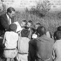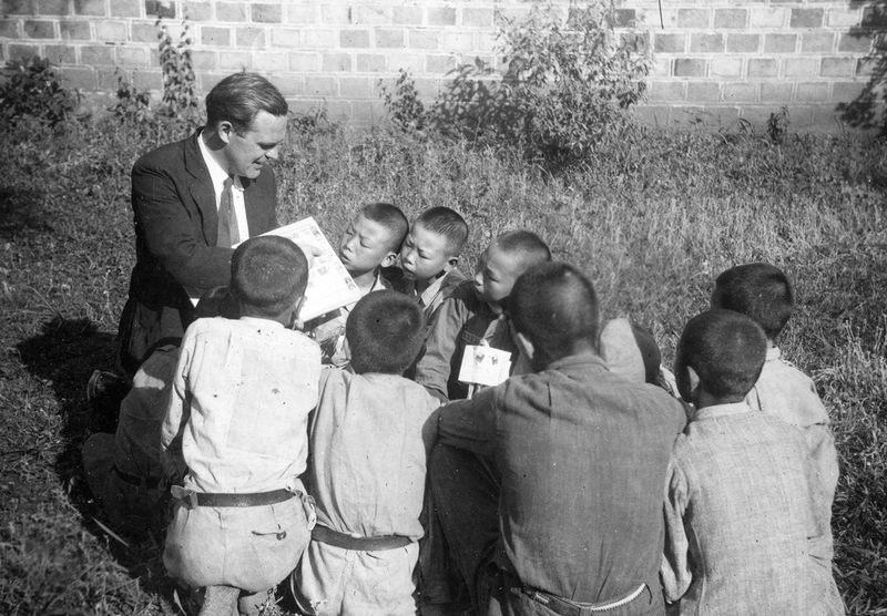 John Stinson instructs a group of eight Chinese boys using a picture book. The group is seated on a lawn before a brick wall.