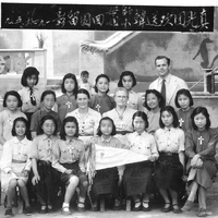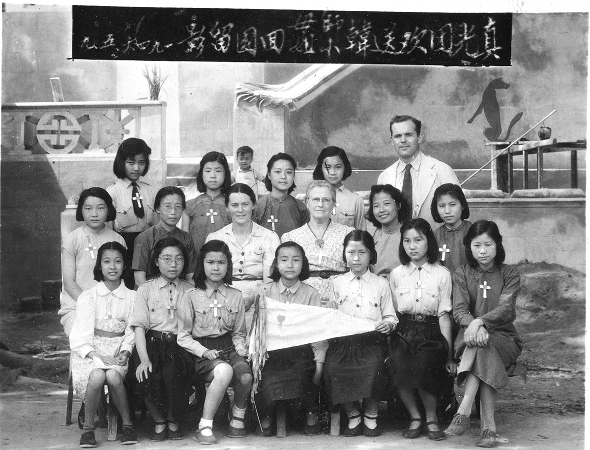 Christian girls' group, possibly Girl Guides, in three rows with John Stinson in the back row, and Lily and Katharine Hockin in the middle row flanked by two unnamed Chinese women. A small toddler peeks between two of the girls in the back row. The girl in the middle of the front row holds a flag with a small heart motif. Most of the girls wear large cross pins. A Chinese inscription is on a banner across the top.
