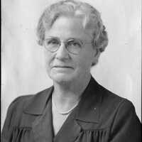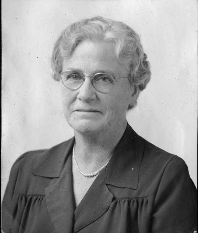 Head and shoulders portrait of Lily Hockin wearing a dark colored blouse or dress with a pearl necklace. She wears glasses and has her hair permed.