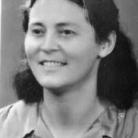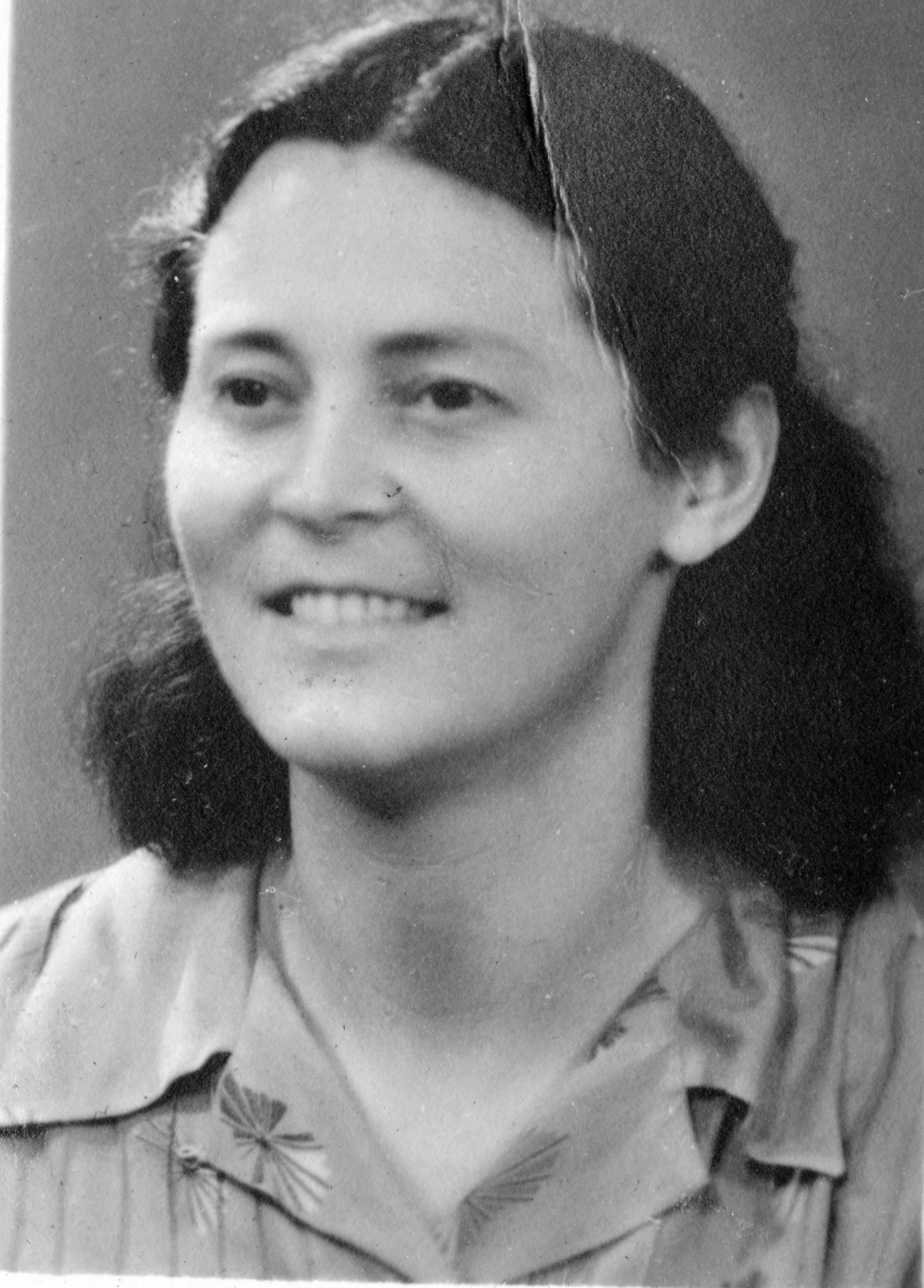 Head and shoulders portrait of Katharine Hockin wearing what looks like a Japanese or Chinese silk blouse or dress. She is smiling and looking away from the camera. A crease in the print makes a mark across her hair.