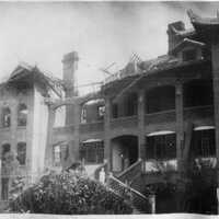 - An unidentified man and woman stand on the front steps of the bombed Tzeliutsing Hospital. The roof and several stories have collapsed on the left side of the building.