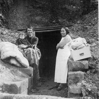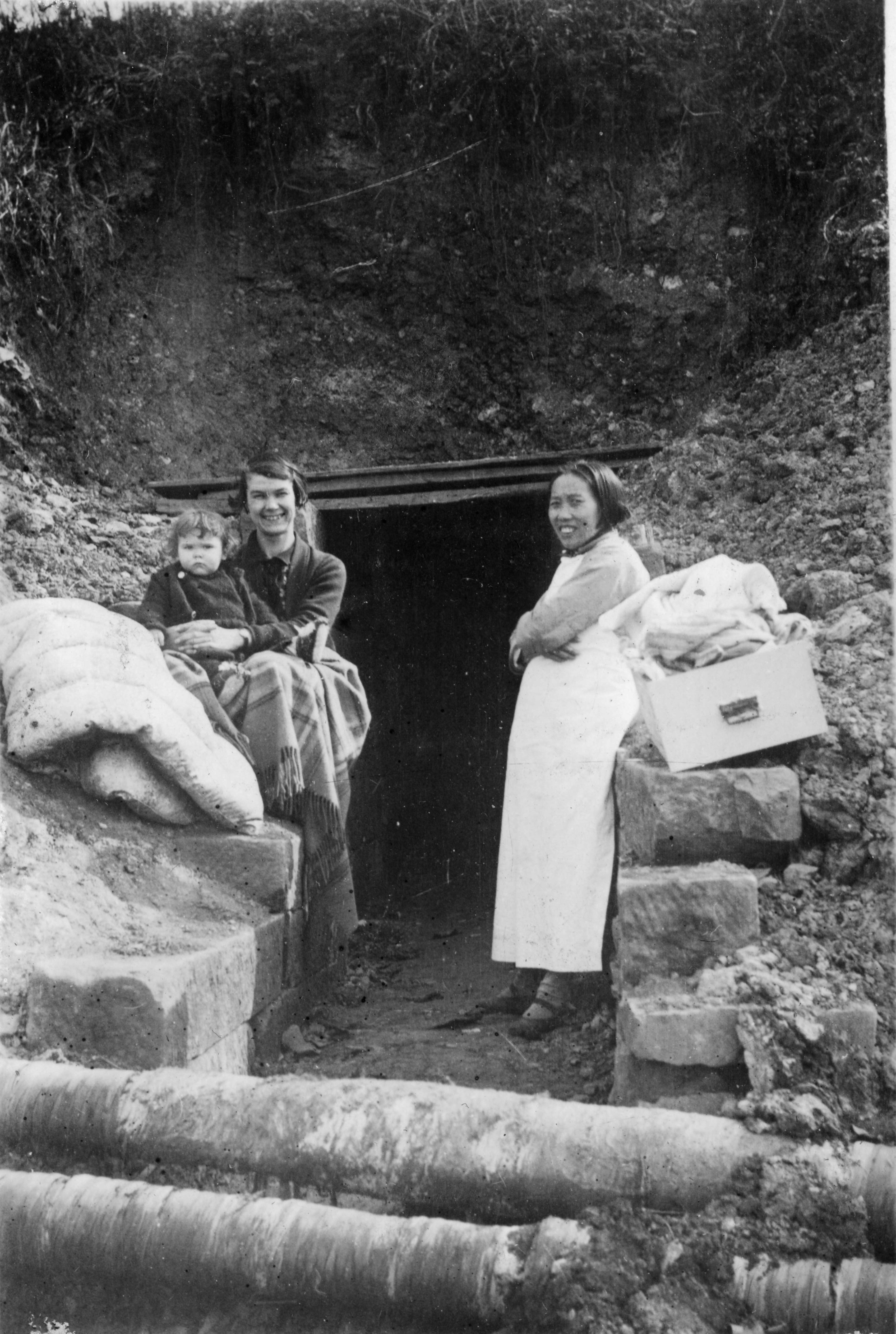 Isabelle Stinson with her son David and their “amah” smiling as they step into their World War II makeshift bomb shelter near their house on the WCUU campus, c.1940.
