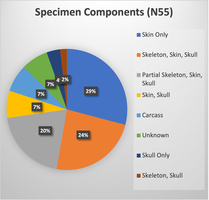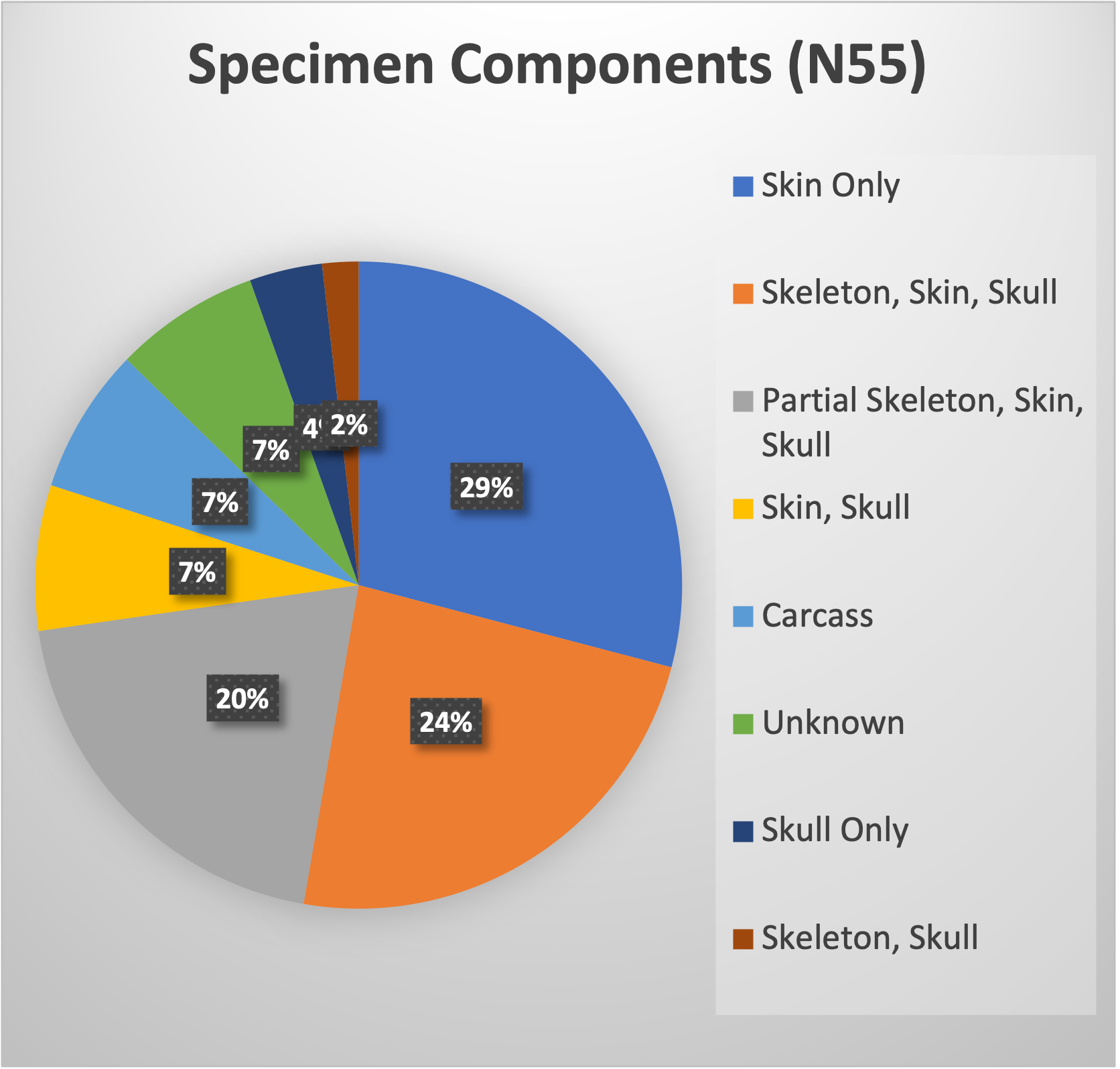 This pie chart shows a breakdown of what components the specimens contained - skin, skull, skeleton, carcass or some combination of the above.