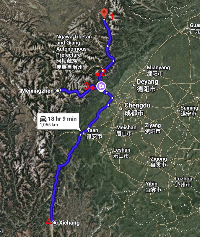 This map shows panda territory extending from Songpan in the north to Xichang in the south, with locations indicated were famous pandas Sulin and Pandora were captured.