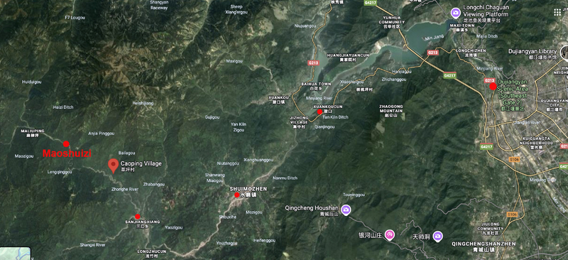This map's annotations show the key locations mentioned by Beatty in the first two days of his account of his and Gilbert Vinden's trip into tribes country in 1938. Starting from Dujiangyan, the pair made it on foot to Caoping in two days. This part of the route follows the Shouxi River all the way. Maoshuizi (Mao Shin Tze), where the pair encountered baby Pandora on their way back is also indicated.