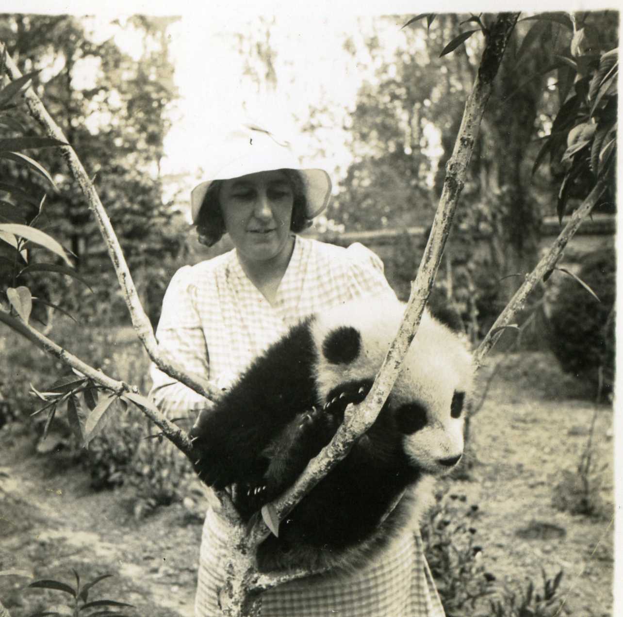 A colorized photograph of Pandora in the same tree from the family archives of Dr. Albert Best is presented in the Vic in China digital exhibit - see references link. This page also includes a photo of two pandas that might depict this same unidentified woman.