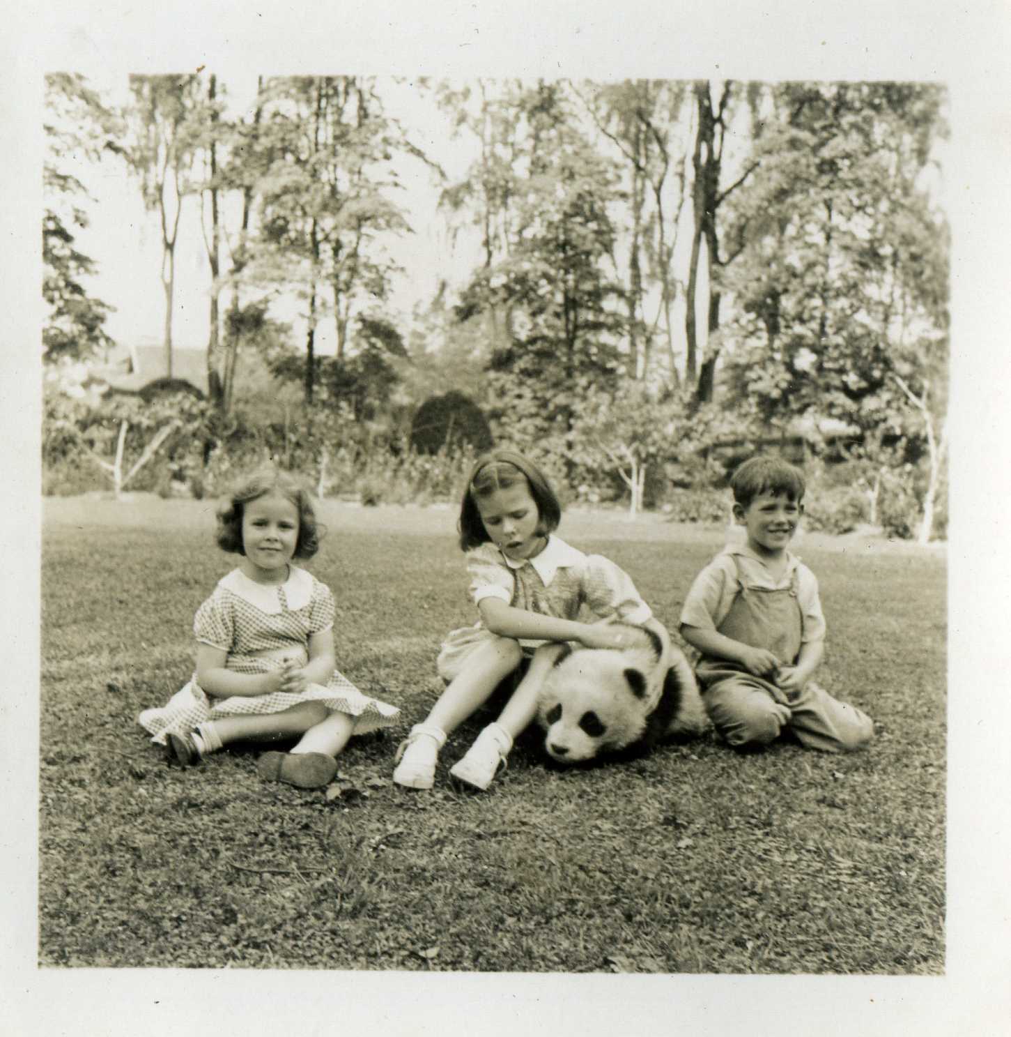 - Three children play with Pandora the panda on a lawn at the WCUU campus. Eleanor Williams and David Spooner are to the left and right of Pandora, respectively. Anne Williams is holding Pandora in the center.