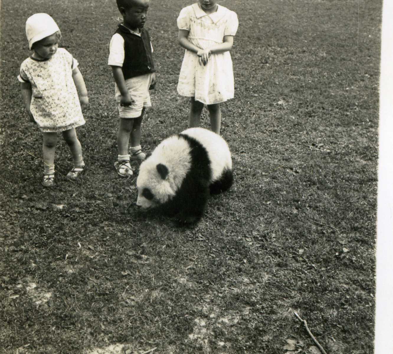 - Three small children - two missionary girls and one Chinese boy - stand around Pandora, who appears to be walking on all fours on a lawn.