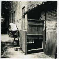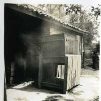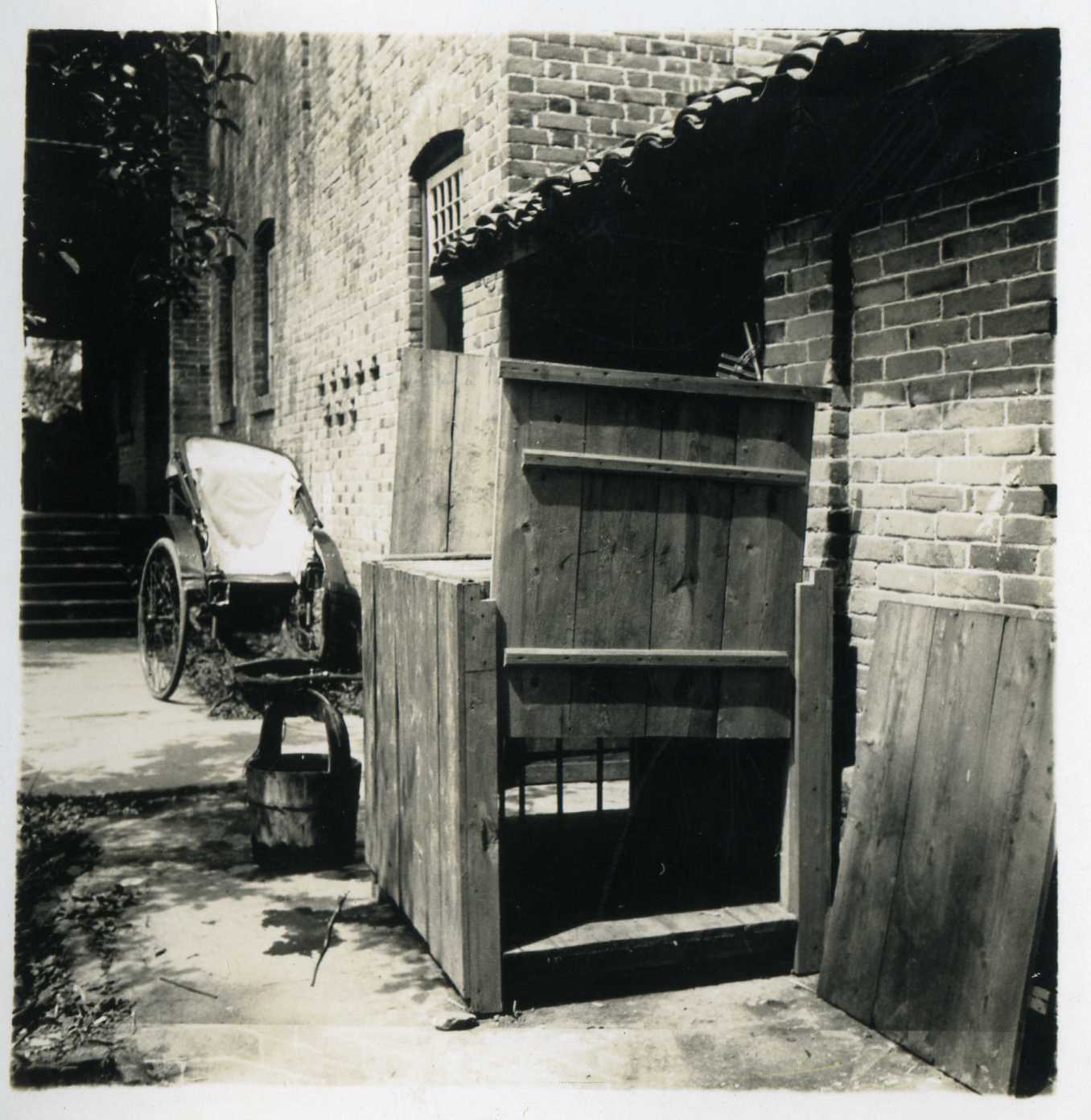 A large wooden cage with a solid back and bars on the front custom-made for panda transport. It is standing next to a brick building with a tile roof, probably the Dickinson home on "Canadian Row." This image shows the back door through which the panda enters. A "chair" can be seen in the background.