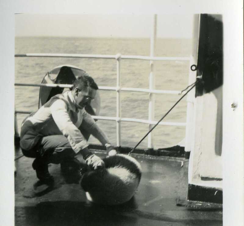Roy Spooner and Pandora on the deck of the President Cleveland. Pandora is lying on her side with Spooner, wearing gloves, reaching out towards her. She is secured by a rope or chain from her neck to the wall of the ship. The ocean can be seen beyond the railing behind them.