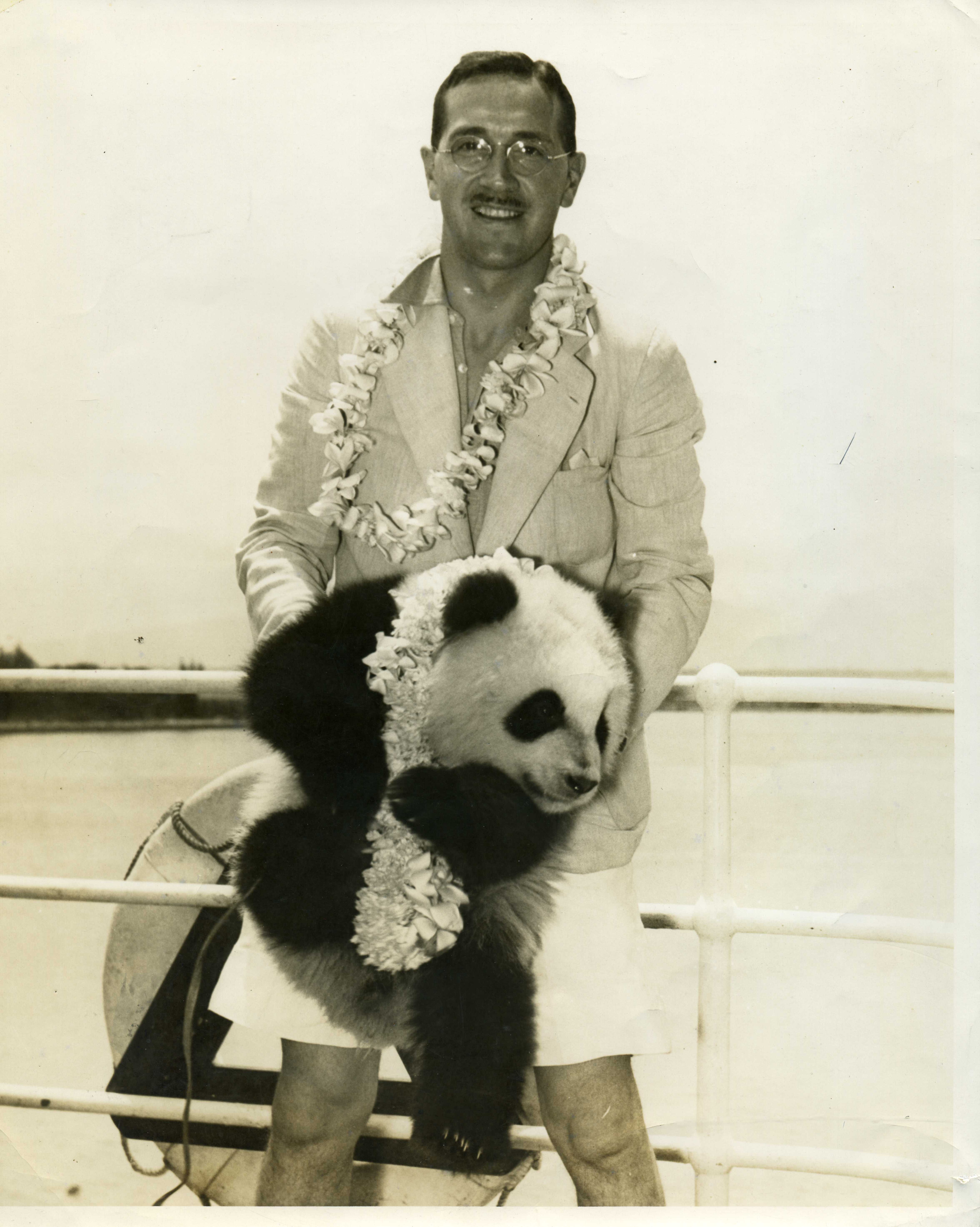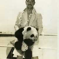 Roy Spooner and Pandora pose on the deck of the President Cleveland during their stopover in Hawaii. Both man and panda wear Hawaiian leis. Roy is holding Pandora facing the camera wearing a suit jacket with shorts.