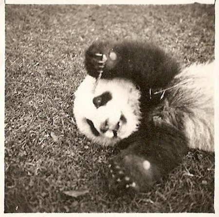 Pandora is lying on her back holding a small stick on the lawn of a missionary home on the WCUU campus. This is probably the home of Frank Dickinson where Pandora lived on "Canadian Row" for two or three weeks in May and June of 1938.