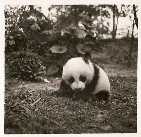 Pandora is crawling on all fours on a lawn with shrubbery behind her. This is probably the Frank Dickinson home where Pandora lived on "Canadian Row" on the WCUU campus for two or three weeks in May and June of 1938.
