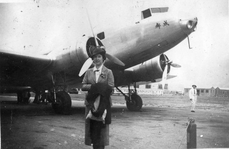 Isabelle Stinson poses in front of the Douglas DC2 14-passenger airliner that was to take her, Win Allen and the three Allen children to Chongqing. The missionary in the background is probably Stewart Allen. The Hong Kong airport can be seen in the distance.