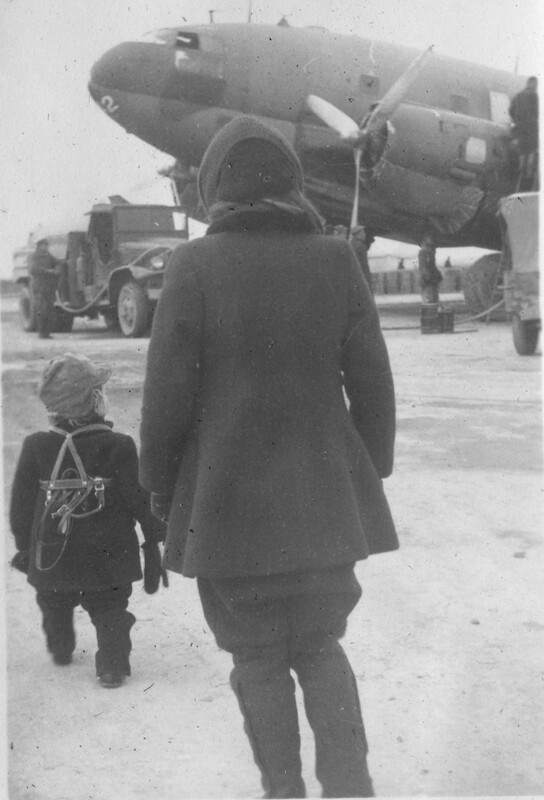 Isabelle and David Stinson (2 years old) seen from behind as they wait for their Curtiss C-46 Commando to be refueled at Hankow, enroute from Shanghai to Chongqing. Both wear winter clothes in the freezing temperatures, Isabelle in a sporty jodhpur ensemble, David is a woolen snow suit. Trucks can be seen next to the plane in the background.