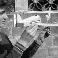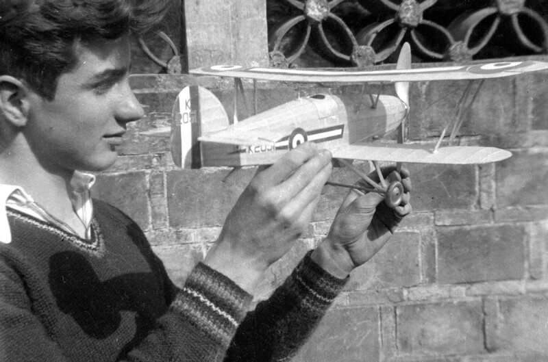 Omar Walmsley is holding a model Hawker Fury biplane next to a brick wall with ironwork at the top.