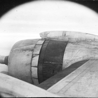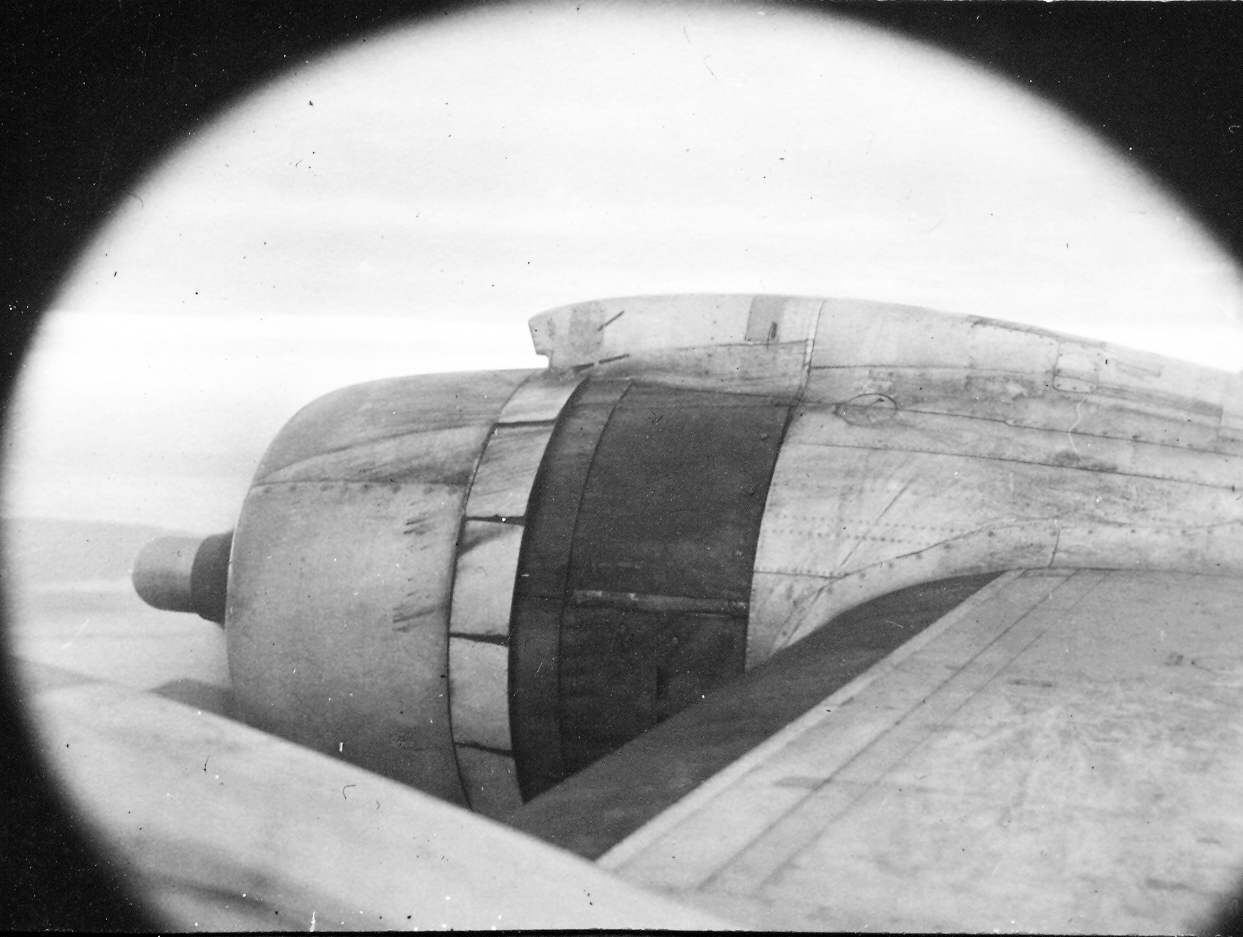 The circular window of the Douglas C-54 Skymaster frames a shot of the wing while in flight.