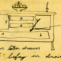 Hand drawing of the dining room buffet has a fruit basket and a pair of candlesticks on top. An arrow points to the bottom drawer where the next clue can be found.