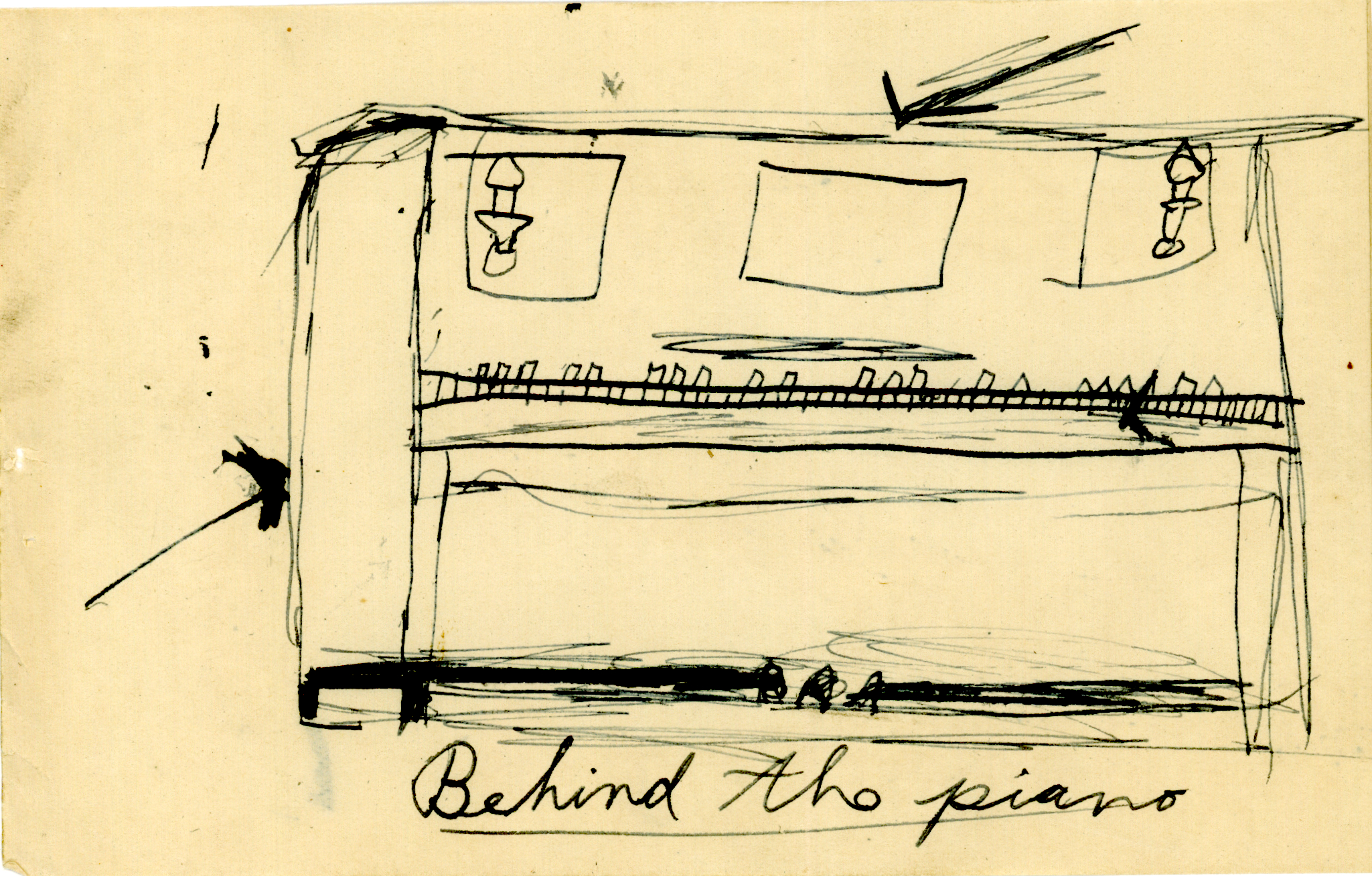 Hand drawing of an upright piano shows motif on front, petals, and white and black keys in proper arrangement. Two arrows point to the side and top, to indicate that the next clue is behind the piano.