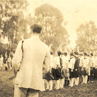 School children stand in two long parallel rows, all holding their arms up high in a salute. In the foreground are two men, seen from behind. One of them has raised his pith helmet in salute.