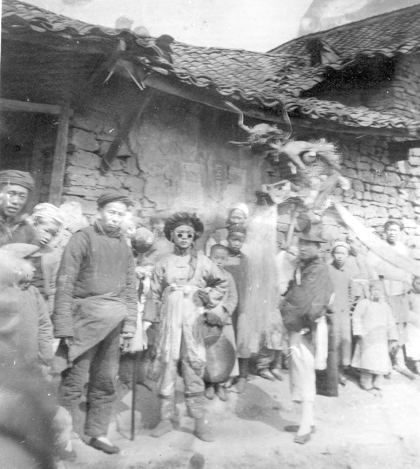 A man holds up a dragon head on a pole with a long streamer trailing behind to the right. In the center, a man with an elaborate cloth wrapped headdress holds a ceremonial umbrella. Villagers observe the scene, some looking straight at the camera. A stone building with a clay tile roof forms the backdrop.