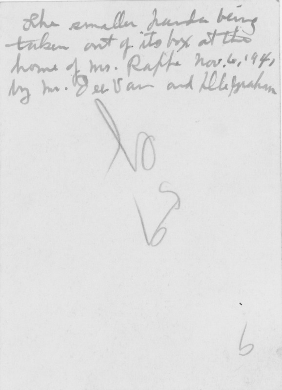 The smaller panda being taken out of its box at the home of Mr. Rappe, Nov. 6, 1941, by Mr. Tee Van and DC Graham.