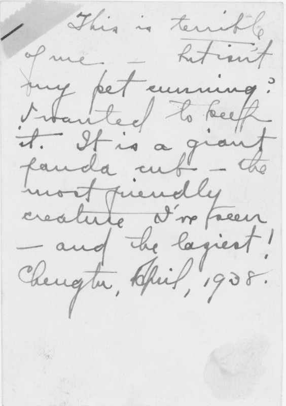"This is terrible of me - But isn't my pet cunning? I wanted to keep it. It is a giant panda cub - the most friendly creature I've seen - and the laziest! Chengtu, April, 1938" Alicia Morey Graham